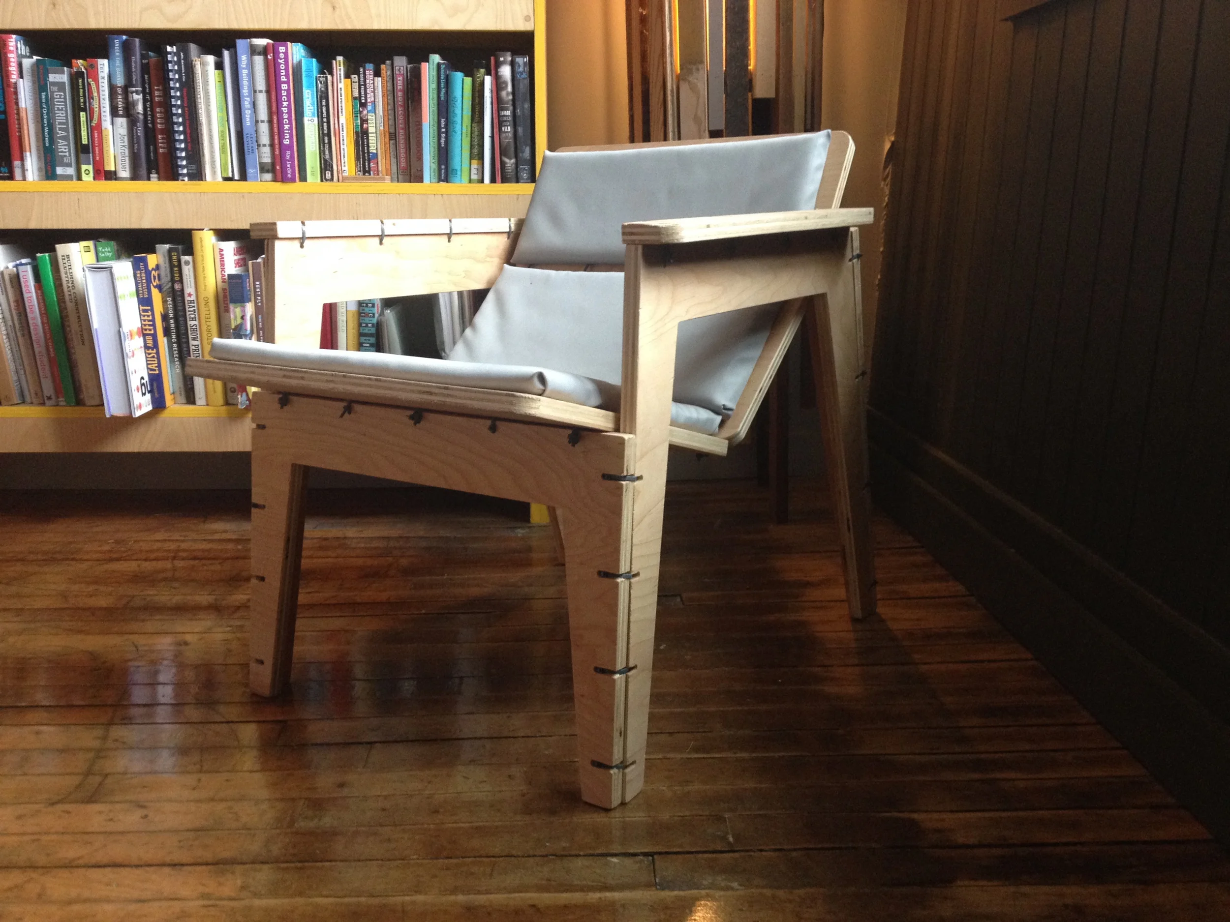I was lucky enough to have it crop up on a few design blogs and featured in Make magazine. Released for free under a Creative Commons license, it has accumulated 2,000 downloads over 10 months. Via social media, I found that at least two people have built one, in Barcelona and Ohio (both using makerspaces). The miserable download-to-build ratio (.09%) illustrates the trouble with truly open-source, digitally fabricated furniture: it's still a lot of work, using machines that are not widely accessible. The chair looked too severe, shaped by the machining method and material constraints. More than a few commenters took issue with the durability and aesthetic of the zip-tie fastening. Six weeks in a gallery show proved their point, as UV light and lots of sitters broke the ties across the front of the seat.
